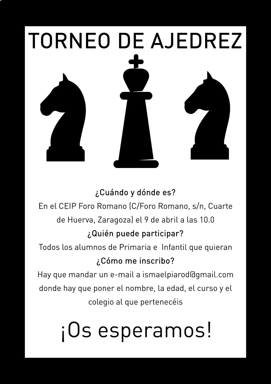 Este sábado día 9 de Abril a las 10:00 tendrá lugar en el CEIP Foro Romano de Cuarte de Huerva un Torneo de Ajedrez organizado por Océano Atlántico, en el que podrán participar los alumnos y alumnas de Infantil y Primaria de cualquier colegio, no hace falta que estén apuntados a ninguna extraescolar de ajedrez, solo importa que sepan jugar un poco y que les apetezca participar y pasárselo bien.