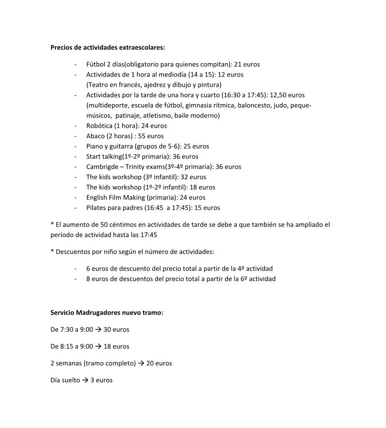 Os dejamos el cuadro provisional de las actividades que se ofertarán al próximo curso, con horarios y precios de las nuevas actividades como de las antiguas.