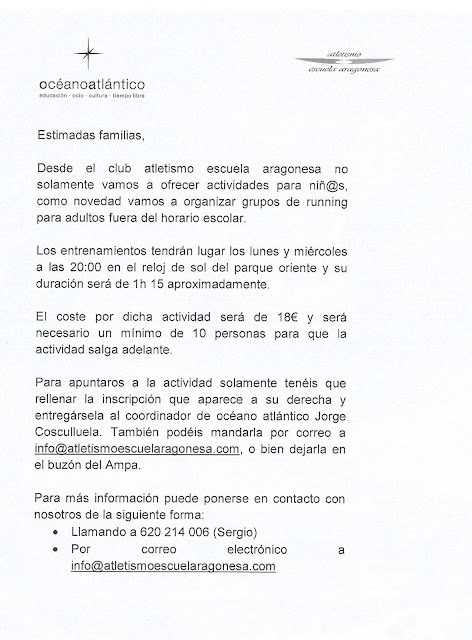 Hace unos días los peques han salido con una circular de la escuela de atletismo aragonesa, para que todos los papis y las mamis deportistas de nuestro colegio se puedan apuntar y hacer un grupo del cole para ir a correr.