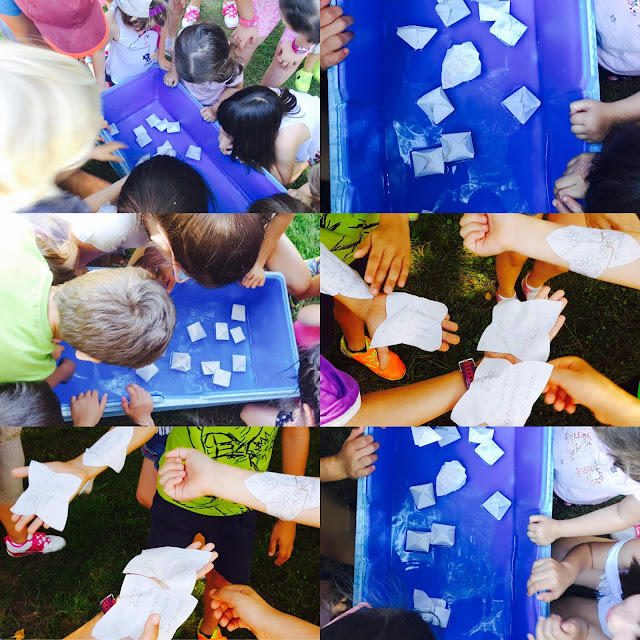 Hemos empezado con unos recortes convertidos en flores, cada peque los pintaba, escribía algo importante sobre la naturaleza y cerraba los pétalos para que nadie viese lo que habían escrito.