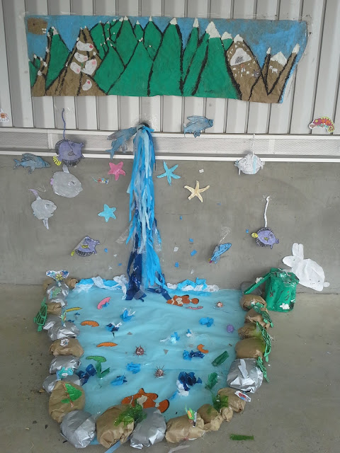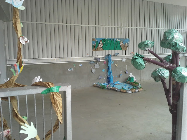 Poco a poco las ideas para que nuestro bosque creciera fueron materializándose, y como por arte de magia, el Jueves ya se empezaban a ver avanzados los primeros árboles, y hasta un estanque de agua brillante que brota misteriosamente de la pared.