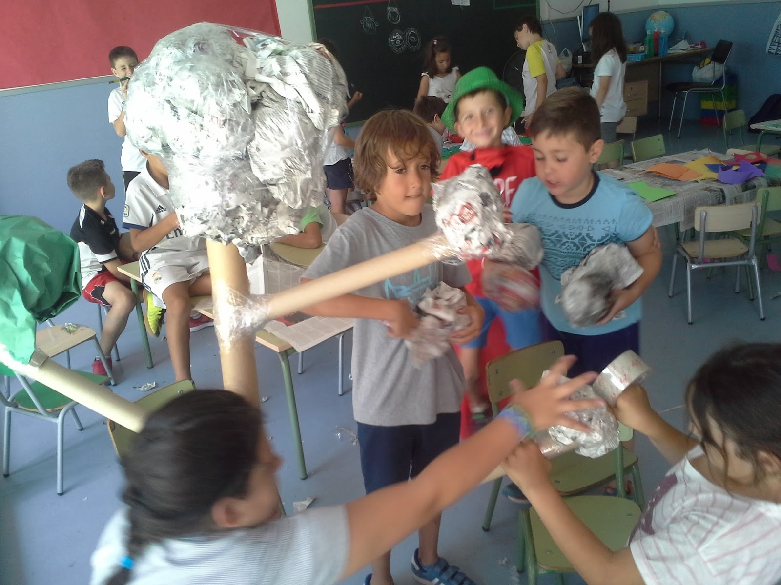 Poco a poco las ideas para que nuestro bosque creciera fueron materializándose, y como por arte de magia, el Jueves ya se empezaban a ver avanzados los primeros árboles, y hasta un estanque de agua brillante que brota misteriosamente de la pared.