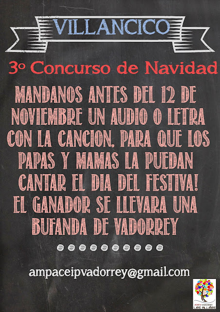 Como sabéis cada año en Navidad los papis y mamis más fiesteros y comprometidos aclaran sus voces y nos alegran el día cantando en el festival de Navidad. Y como sabéis las letra la ponéis vosotros, así que, cantautores y cantautoras, afinad vuestros instrumentos e id pensando en la próxima canción de Navidad… de prisa no tenéis mucho tiempo!!!