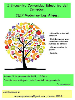 Familias, os invitamos a participar en el I Encuentro de la Comunidad Educativa del comedor del CEIP Vadorrey Les Allées que se celebrará el martes día 5 de febrero a las 16:30 h en la sala multiusos. Pretendemos que toda la Comunidad Educativa esté presente: Dirección, de Catering, Monitores y Familias, con el objetivo de hacer este espacio lo más saludable y confortable para tod@s.
