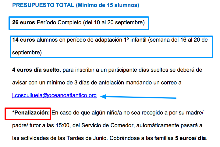 La fecha límite para apuntarse será el 31 de Agosto. Todas las inscripciones se harán por la página web de océano atlántico. Cualquier duda o consulta podéis contactar con j.cosculluela@oceanoatlantico.org o con extraescolaresampavadorrey@gmail.com