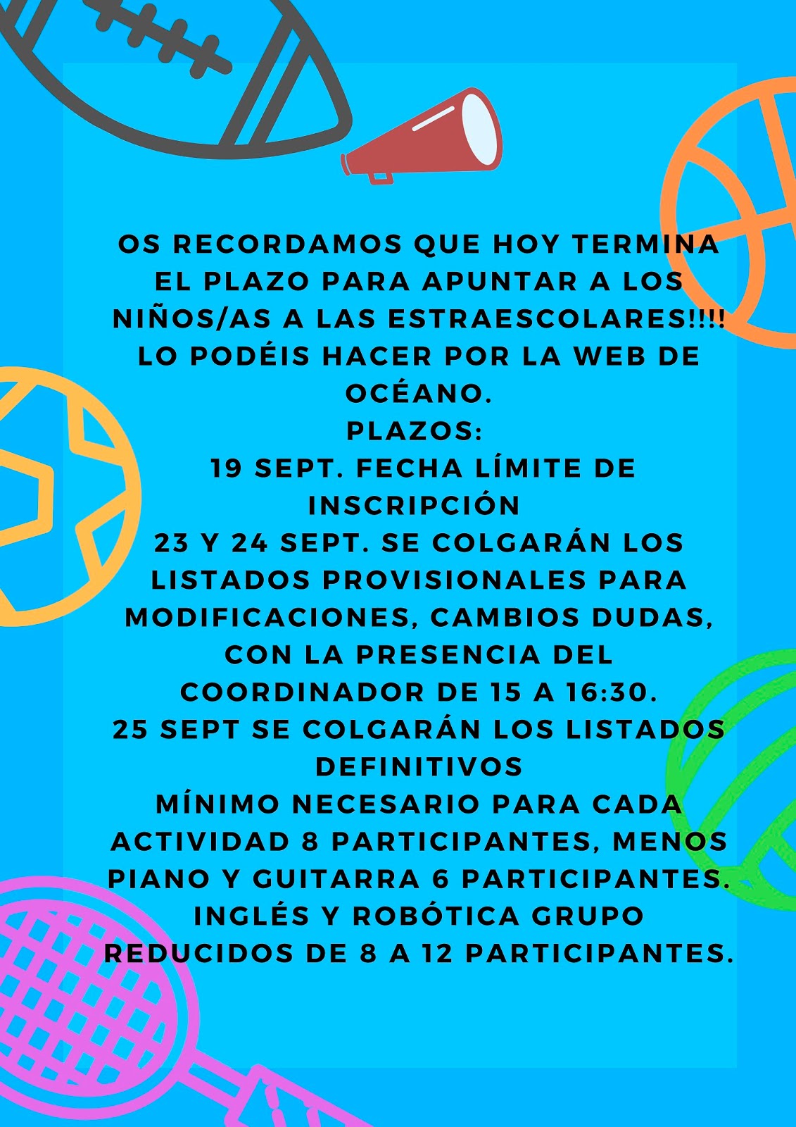 Plazos de las extraescolares. ¡¡¡Hoy último día para apuntarse!!! por AMPAVadorrey | Sep 19, 2019 | Uncategorized | 0 Comentarios Os dejamos el enlace directo para poder acceder a las inscripciones on line en la web de océano Enviar comentario Cancelar la respuestaLo siento, debes estar conectado para publicar un comentario.