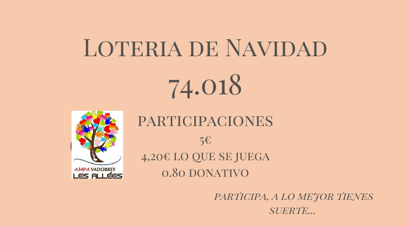 Ya empezamos a vender, cuando veáis a los de la junta podéis empezar a preguntar, y los días 29 y 30 estaremos en el cuarto del AMPA y venderemos allí lotería de 16:30 a 17:00.