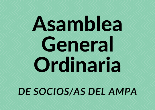Se convoca a socios y socias del AMPA a la Asamblea General Ordinaria que tendrá lugar el miércoles 4 de noviembre en primera convocatoria a las 16:15h y en segunda convocatoria a las 16:30h por vía telemática a través del siguiente enlace: https://meet.google.com/pat-xpqn-ody