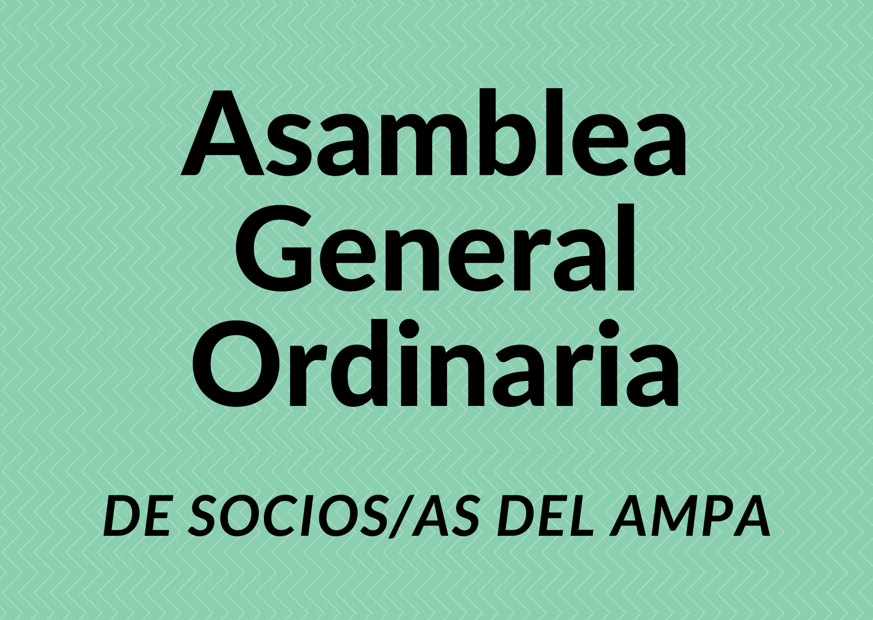 Se convoca a socios y socias del AMPA a la Asamblea General Ordinaria que tendrá lugar el miércoles 4 de noviembre en primera convocatoria a las 16:15h y en segunda convocatoria a las 16:30h por vía telemática a través del siguiente enlace: https://meet.google.com/pat-xpqn-ody