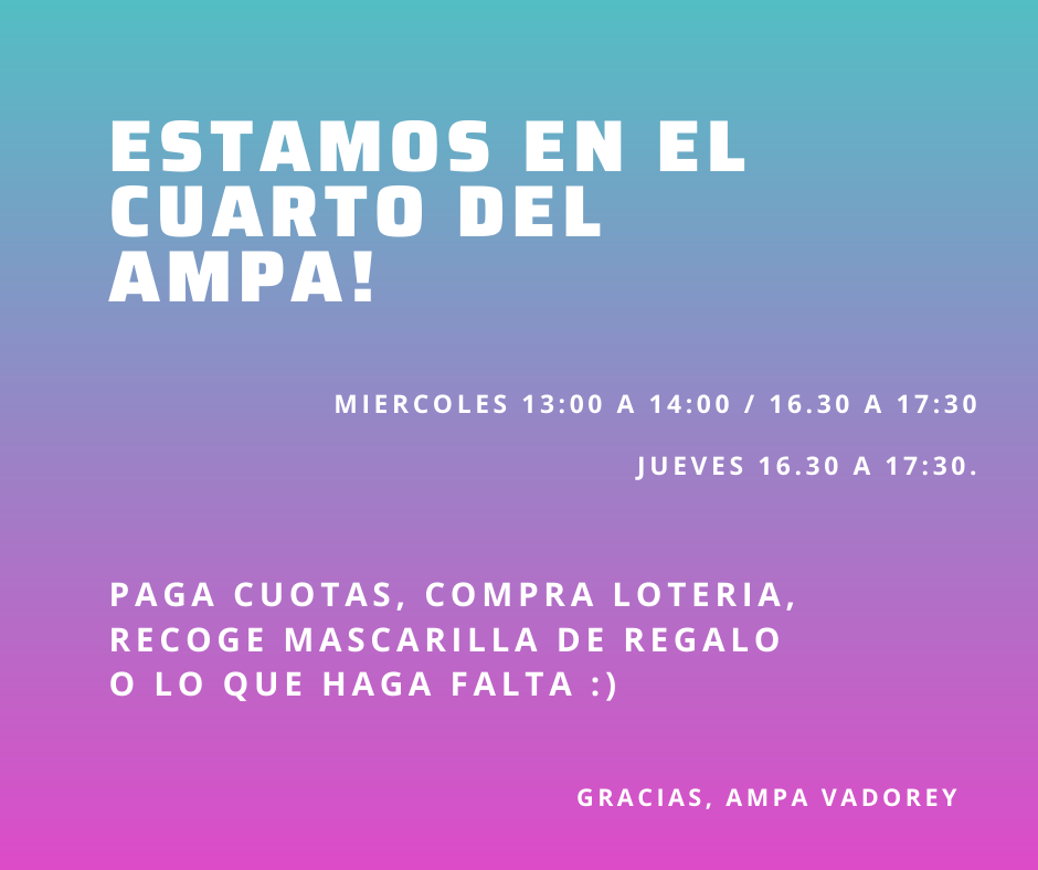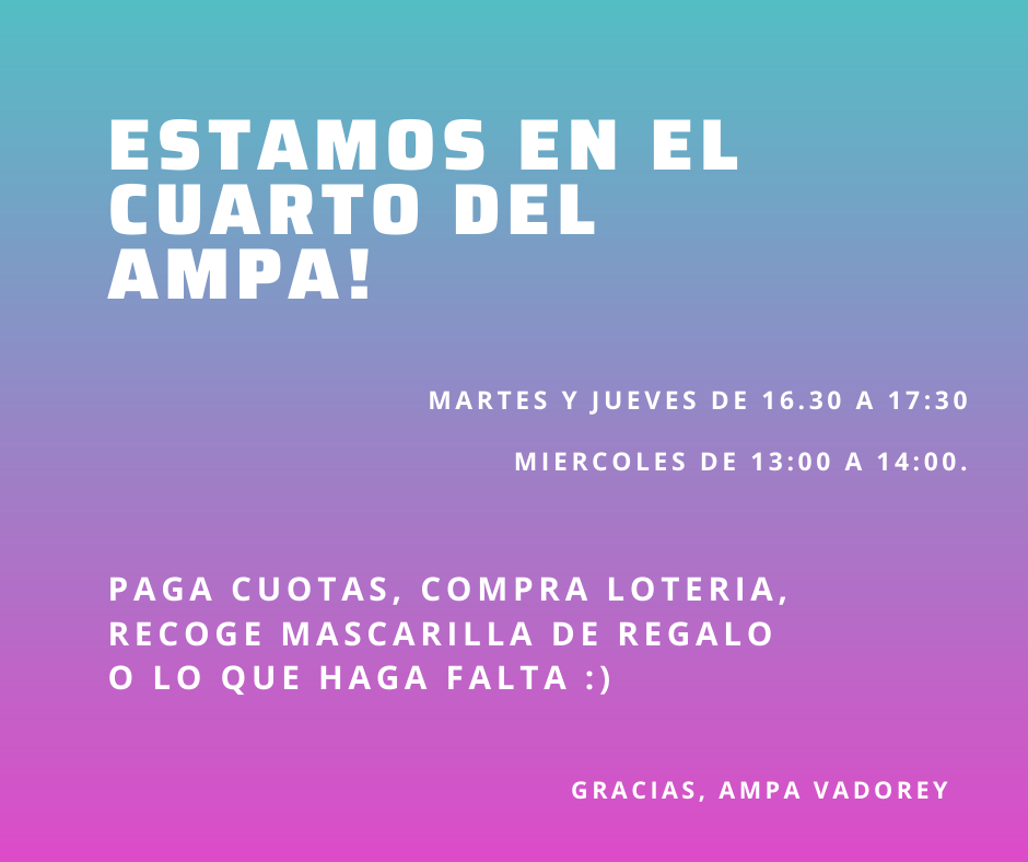 Si necesitas pagar la cuota, recoger tu mascarilla gratis, comprar loteria de navidad, o charlar un rato sobre algo del cole, estaremos en el cuarto del ampa esta semana el Martes y Jueves de cuatro y media a cinco y media y el Miercoles de una a dos.